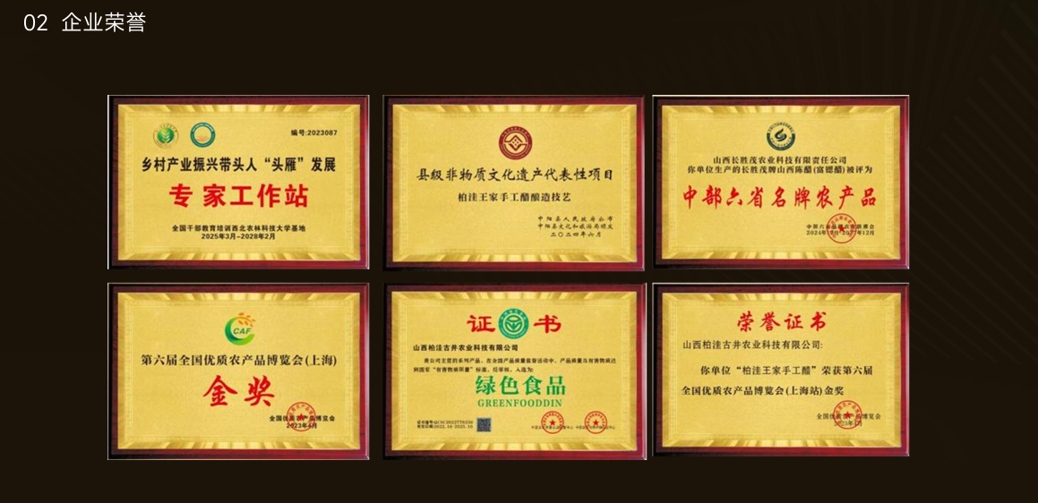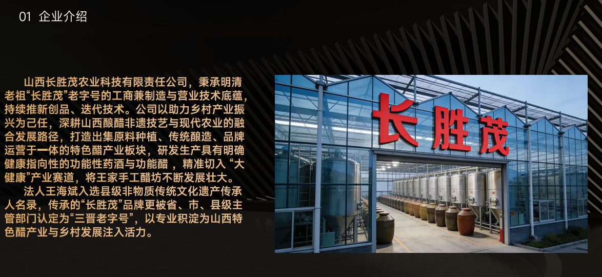 山西长胜茂农业科技有限责任公司,秉承明清老祖“长胜茂”老字号的工商兼制造与营业技术底蕴持续推新创品、迭代技术。公司以助力乡村产业振兴为己任,深耕山西酿醋非遗技艺与现代农业的融合发展路径,打造出集原料种植、传统酿造、品牌运营于一体的特色醋产业板块,研发生产具有明确健康指向性的功能性药酒与功能醋,精准切入“大健康”产业赛道,将王家手工醋坊不断发展壮大。法人王海斌入选县级非物质传统文化遗产传承人名录,传承的“长胜茂”品牌更被省、市、县级主管部门认定为“三晋老字号”,以专业积淀为山西特色醋产业与乡村发展注入活力。